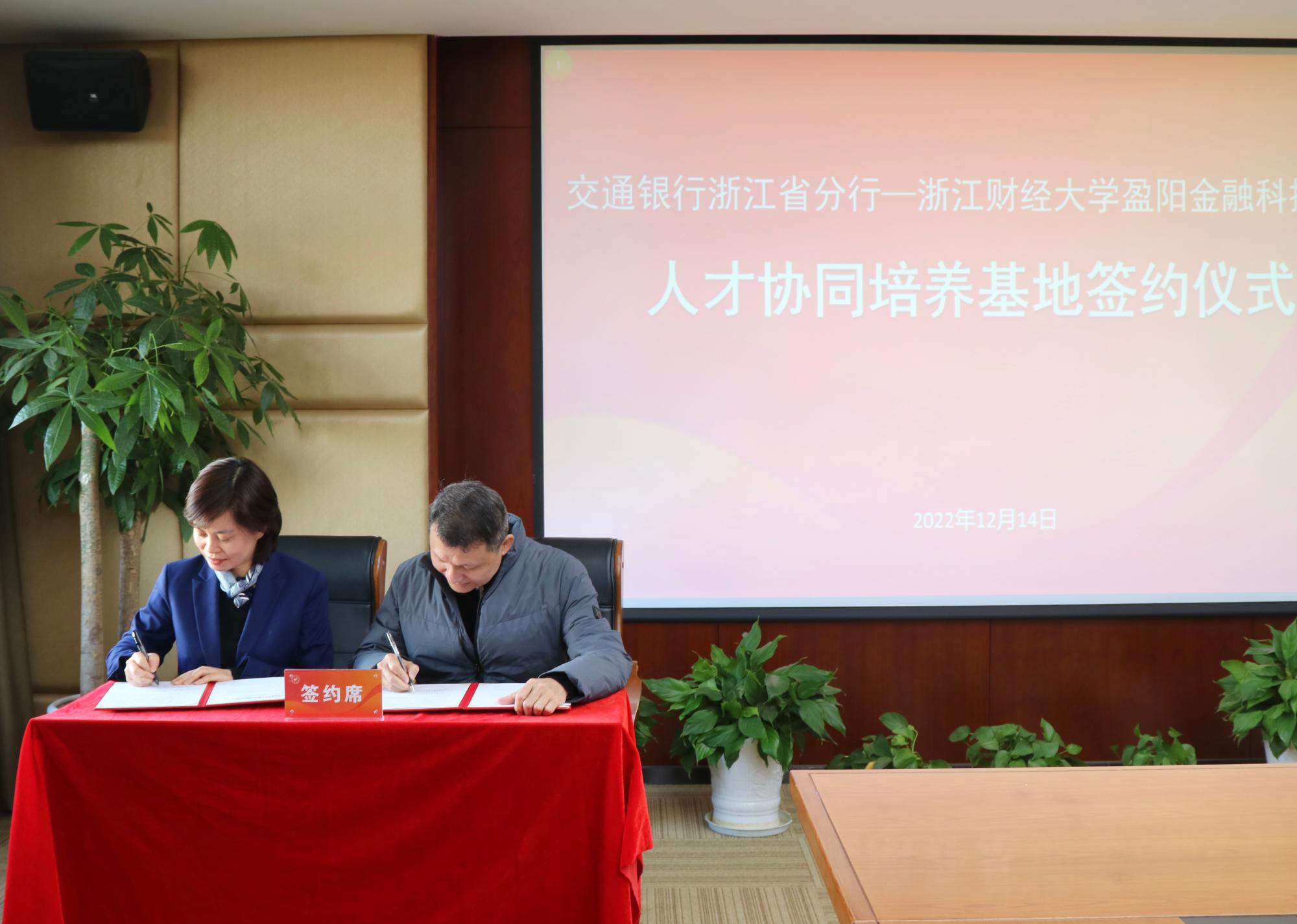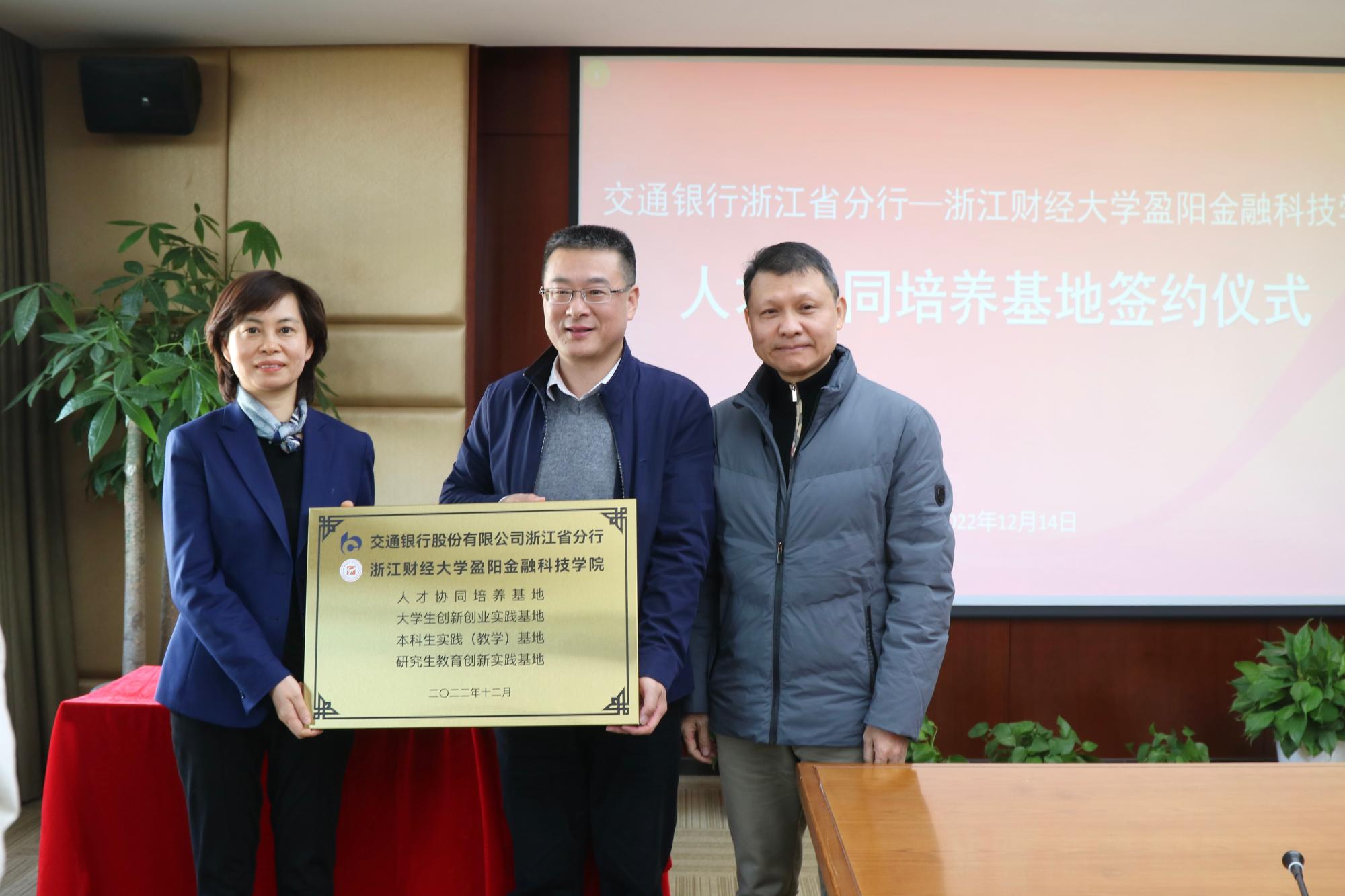 院长张文宇与交通银行浙江省分行人力资源部总经理徐丽丹签约,校党委委员、副校长徐晓东授牌。